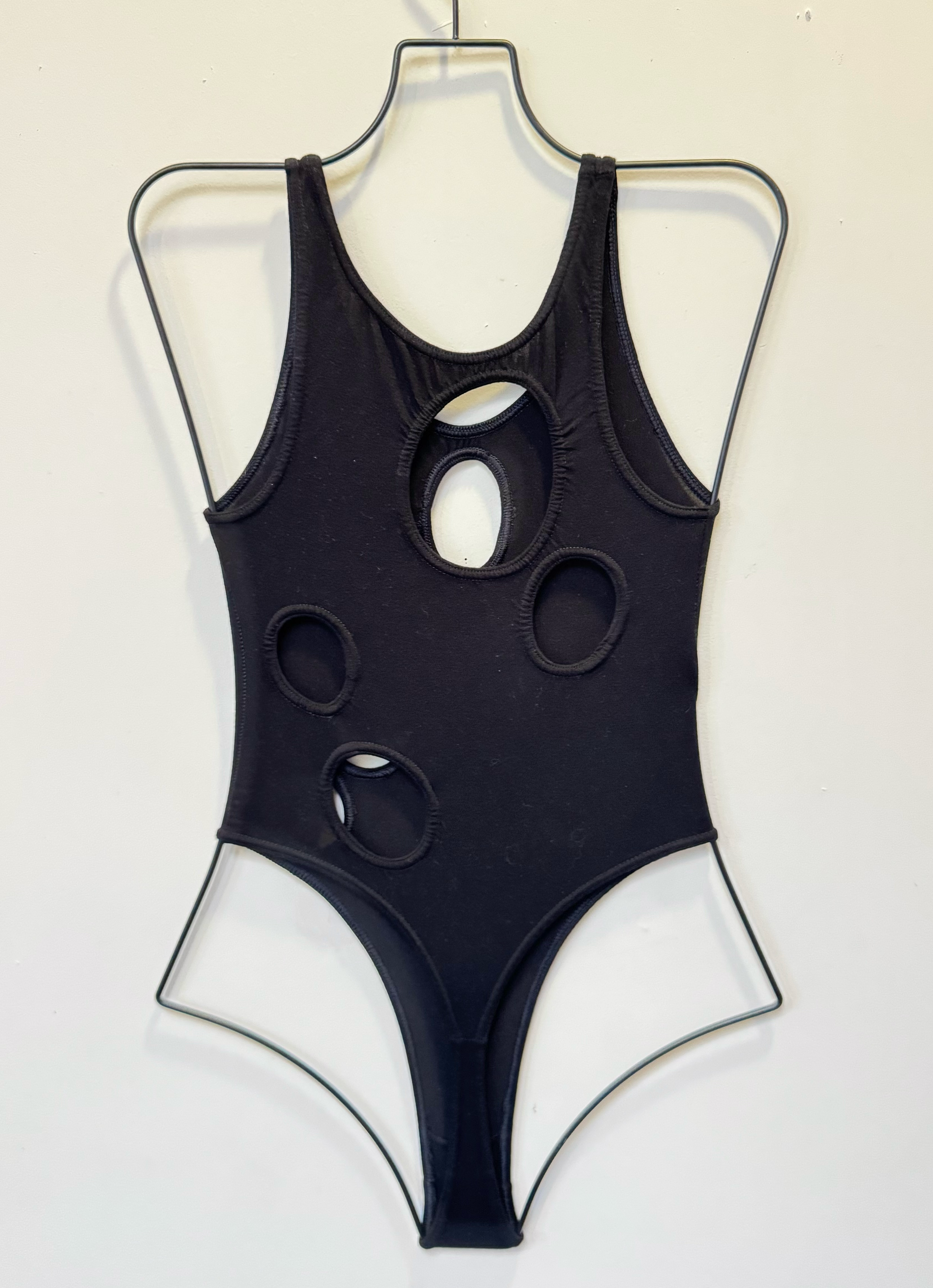Black Holey Bodysuit sample, thong bottom variation, size S